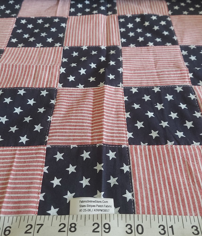 FABRIC: Preppy Patchwork Patriotic Fabric with printed stars & woven stripes.