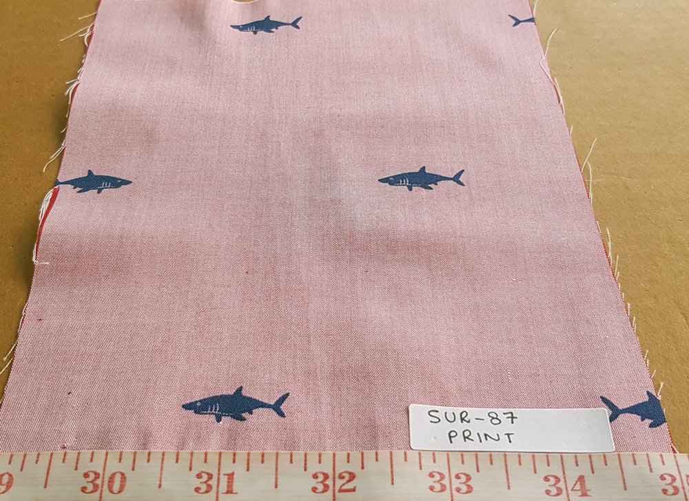 Shark print theme fabric, made of cotton, with a beautiful print of blue sharks, on a base fabric of pink cotton chambray. This is a perfect fabric for any craft projects and sewing for shark theme children apparel, such as boy’s shorts, shirts, pants, ties, bowties, pocket squares, and jackets, as well as being great for girl’s dresses, tops, skirts, and pants.